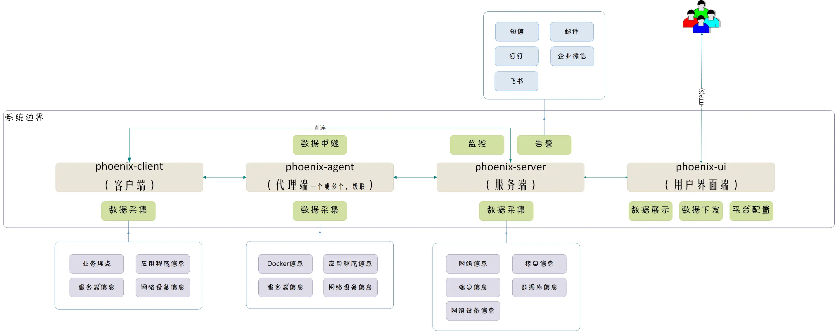phoenix-server:监控服务端,是监控平台的核心模块,用于汇聚、分析监控信息,在发现异常时实时推送告警信息;